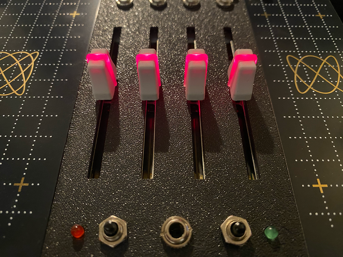 Four slide pots, two buttons, and LED feedback. Everything is immediate — no display, no diving, no distractions.